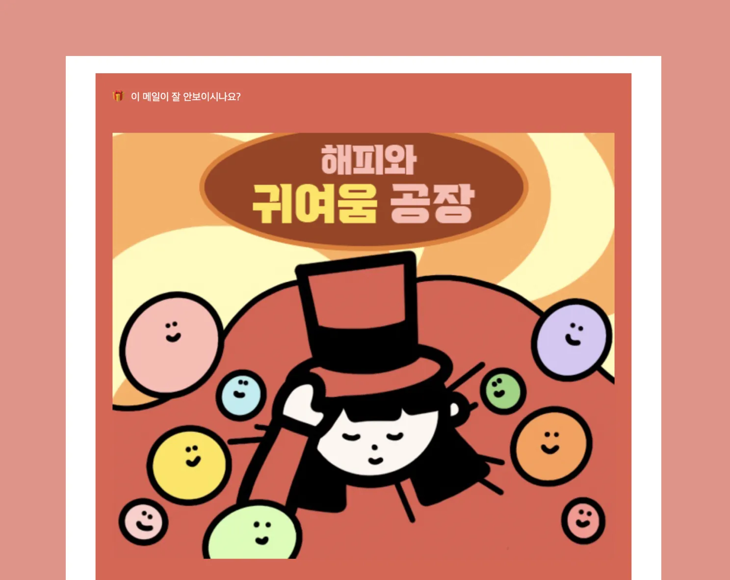 <해피와 귀여움 공장>은 매주 월요일 아침 9시, 세상의 다양한 귀여움과 관련된 이야기를 전달하는 뉴스레터입니다. 누군가에게 줄 깜짝 선물을 준비하는 마음으로 새로운 주제와 예상치 못한 이야기들을 한가득 건네 드리고 있어요. 외형적인 귀여움뿐만 아니라 공간, 물건, 음식, 예술 등 온갖 종류의 귀여움을 보내 드려요.