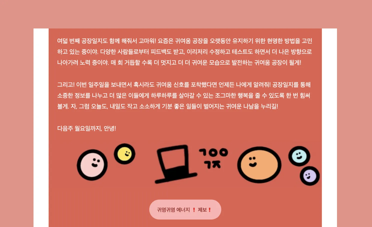 반복되는 일상 속에서도 귀여움을 발견하길 바라는 마음에서 시작된 뉴스레터인 만큼 구독자들의 피드백은 저에게 정말 커다란 의미를 가지고 있어요. 구독자들이 마주친 귀여움을 제보할 수 있도록 항상 뉴스레터 마지막에 '귀염귀염 에너지 제보'를 부탁하곤 하는데요. 작은 귀여움이 하나 둘 모여 더 많은 이들의 하루가 행복해질 수 있다는 믿음을 구독자들과 함께 공유하고 있다는 사실이 뉴스레터의 원동력이 됩니다. 구독자와 소통하며 함께 뉴스레터를 만들어간다는 느낌을 전하고 싶어 제보받은 귀여움은 바로바로 다음 뉴스레터에서 소개하고 있어요.