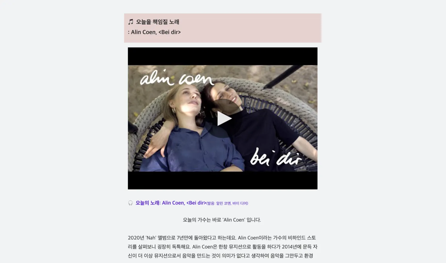 초기 모델은 독일 팝송으로 시작했는데, 지금은 점차 “독일 문화 큐레이션”으로 영역을 확장하려고 해요. 독일 영화, 드라마 등 콘텐츠들을 큐레이션 하면서 구독자님들의 쉬는 시간을 책임지기 위해 노력하고 있습니다.