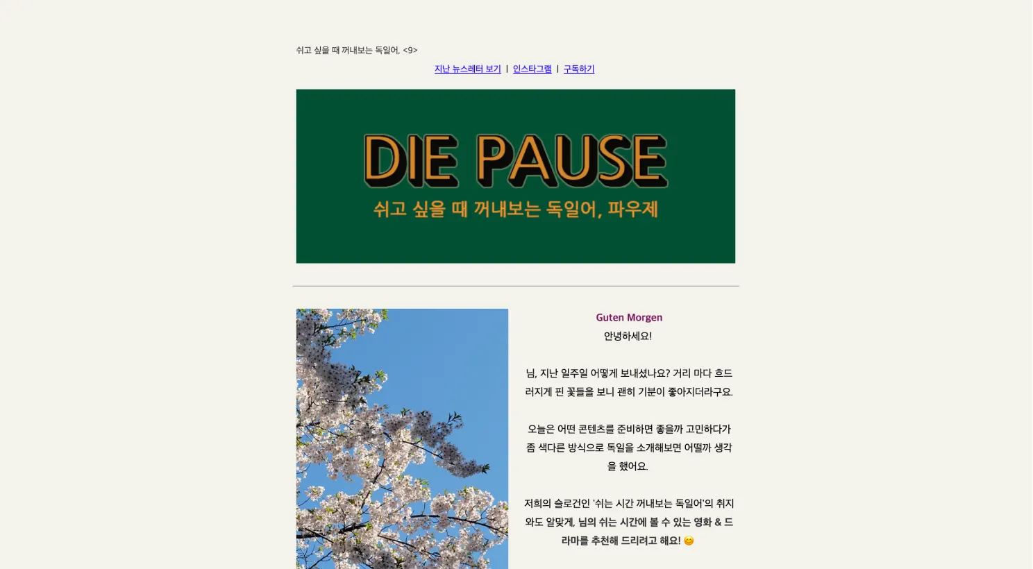 안녕하세요, 저희는 “쉬고 싶을 때 꺼내보는 독일어”의 파우제 에디터 주나와 윰윰입니다. “Die Pause(파우제)”라는 독일어 단어는 “휴식”이라는 뜻을 가지고 있어요. 이름만 봐도 힐링이 되었으면 하는 바람입니다. 저희는 독일 노래 등 문화 콘텐츠를 알고 싶어 하는 사람들, 그리고 독일어 전공하는 사람들을 위해 저희는 매주 독일 노래를 추천해서 알려드리고 있어요.
