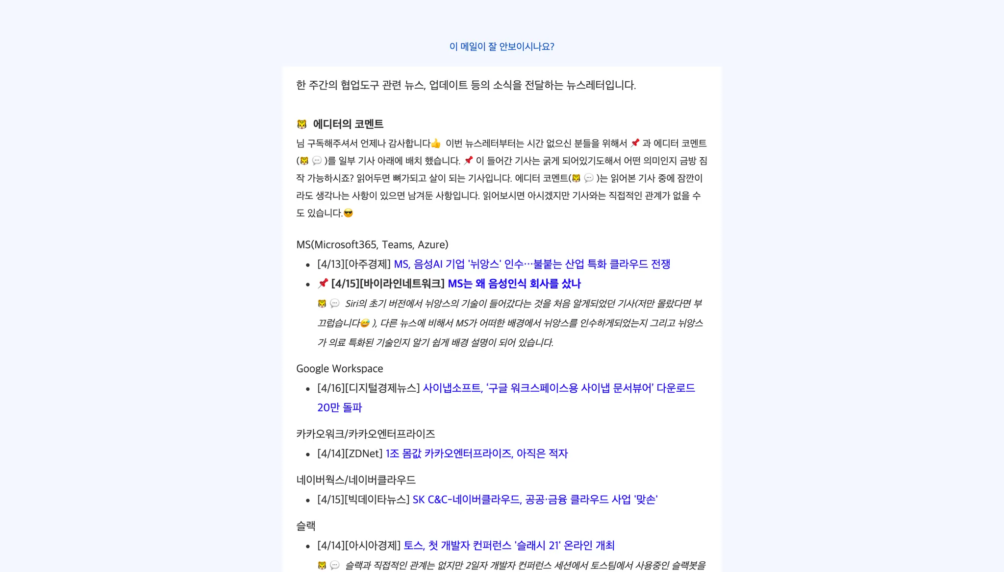 단순하게 뉴스만 모으는 것을 넘어, 한 주간 업데이트된 기능들에 대해 분석하는 분석 섹션을 넣고 싶습니다. 구독자가 많아지면 '협업도구를 만드는 사람들'이라는 주제로 관련 인터뷰도 싣고 싶고요. 어피티 뉴스레터처럼 전산 담당자가 해결하지 못한 부분을 접수받아 도구로 대안을 제시하는 방법도 고민하고 있어요. 3주는 주간 레터를 보내다 마지막 주에는 3주 간의 뉴스레터 중 클릭이 많았던 콘텐츠 위주로, 뉴스레터를 편집해볼 생각도 하고 있습니다.