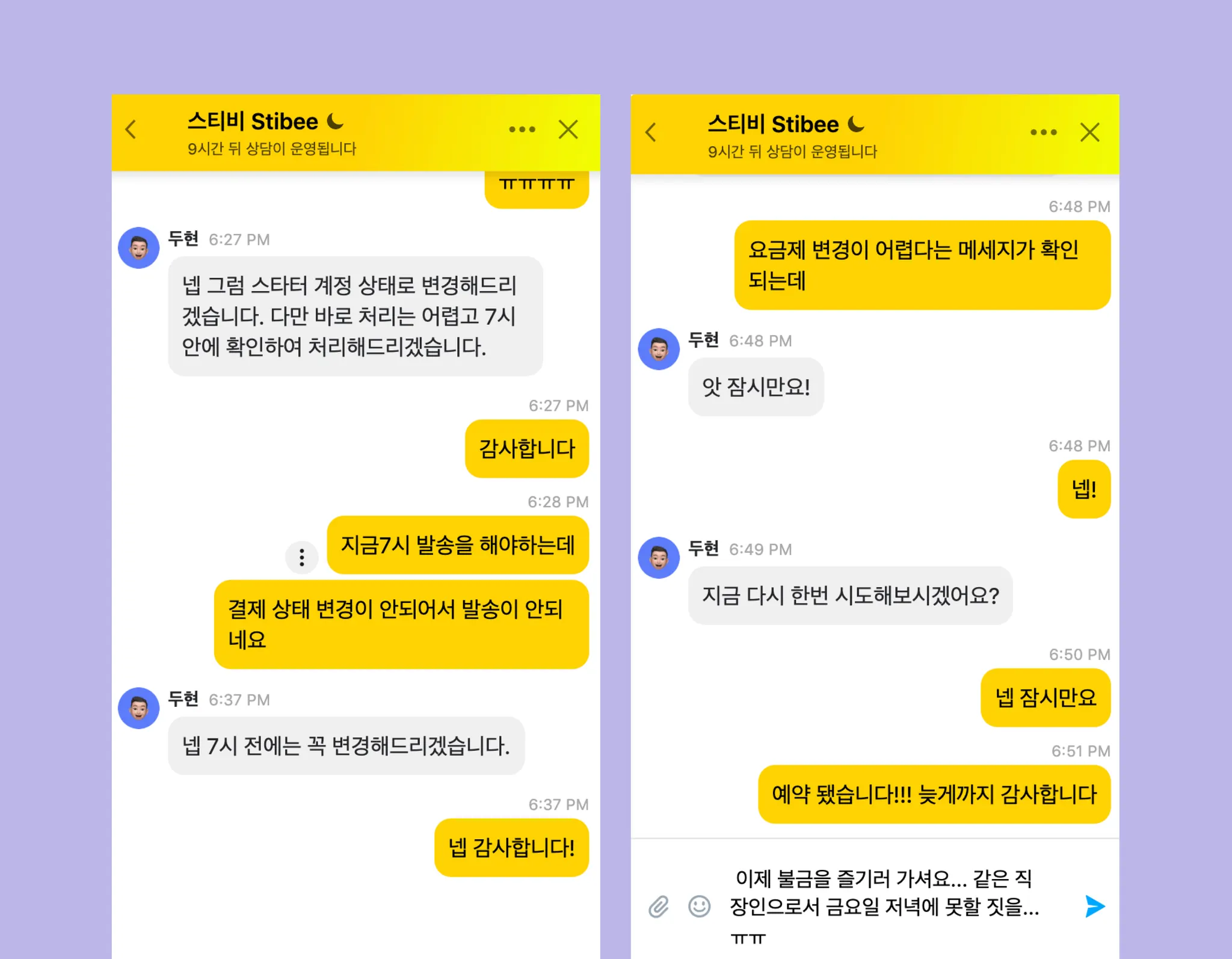 세 번째로, 서비스 이슈가 생겼을 때 언어장벽 때문에 고객 문의가 어렵고 힘들었어요. 시차 때문에 문의 답변 받는 데도 한참이나 걸렸죠. 반면 스티비에서는 이슈가 생기면 문의를 통해 바로바로 답변을 받을 수 있었습니다. 채팅으로 대화할 수 있는 것도 편했고요.