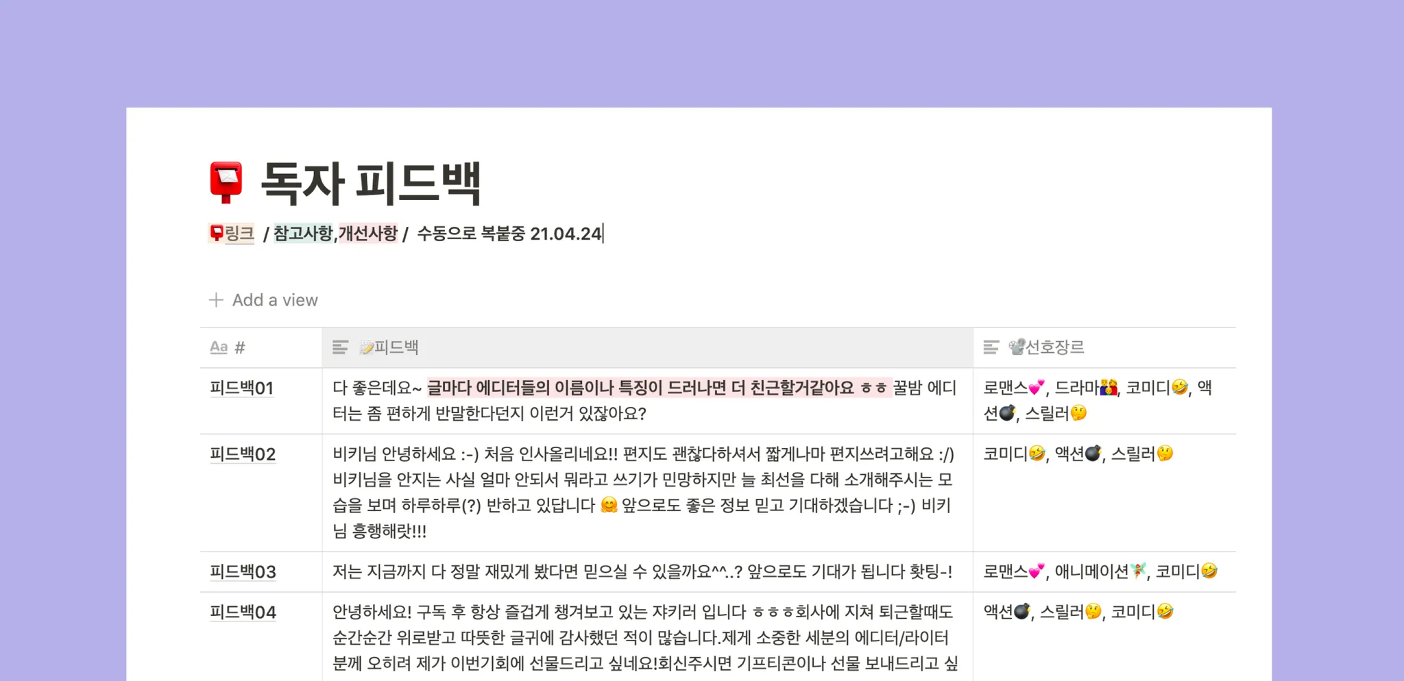 이러한 피드백 덕분에 뉴스레터 발행 전, 작품이 가진 사회적 맥락을 두세 번 체크하고 있습니다. 조금이라도 이슈가 있을 것 같다 싶으면 무조건 에디터 셋이서 갑론을박하고요. 그래도 대부분은 "내가 좋다고 생각한 데는 그럴 만한 이유가 있다! 그러니 소개하자!"라는 결론에 도달하긴 하지만요.