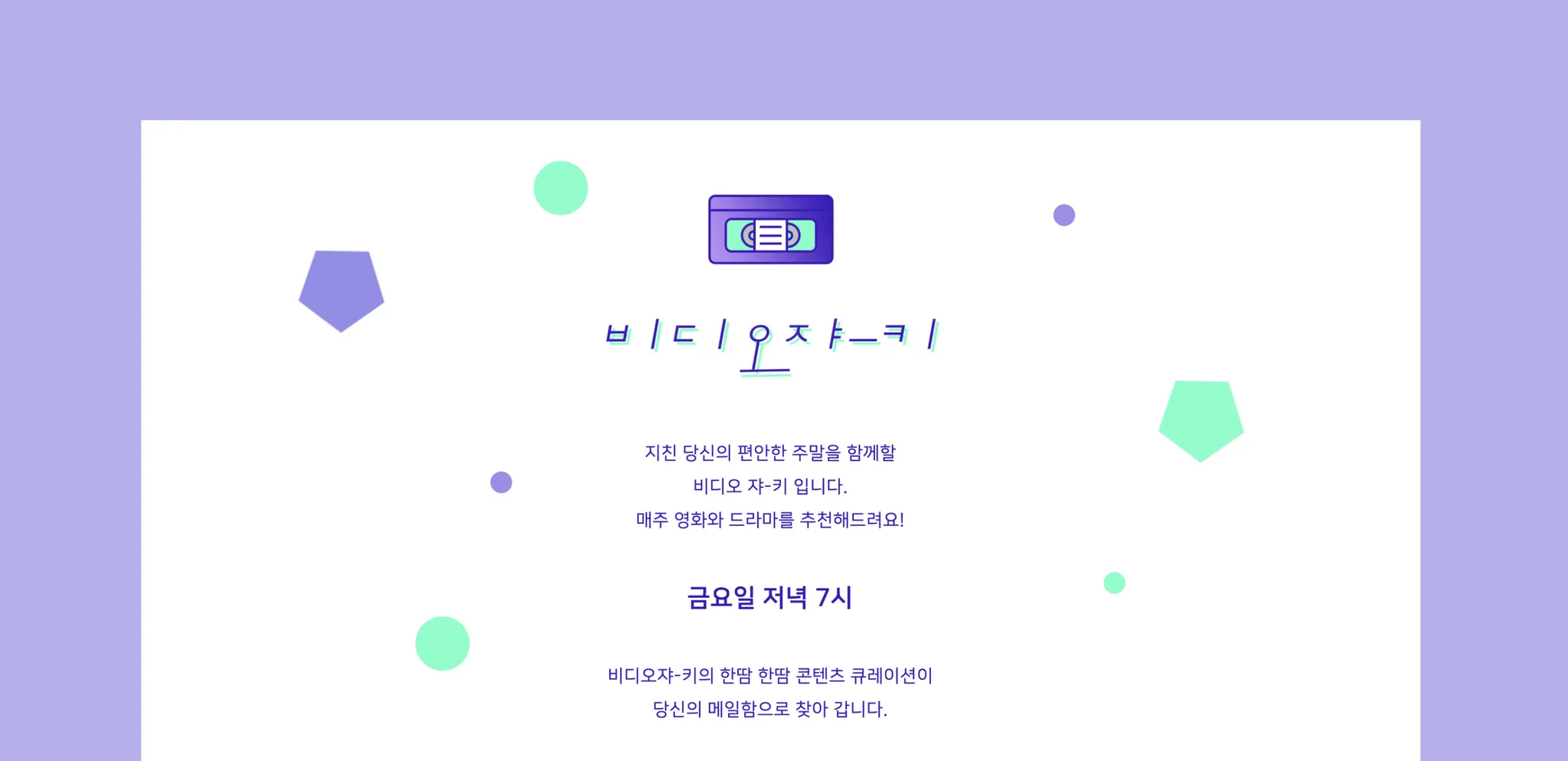 비디오쟈-키는 알고리즘에 만족하지 못하고 색다른 재미와 즐거움을 찾는 사람들을 위한 뉴스레터예요. 옛날 비디오 가게에서 "뭐 볼 만한 거 없어요?"라고 물어봤을 때, 엄청나게 재밌진 않아도 그럭저럭 볼만한 영화를 추천해주던 알바생 같은 레터가 되길 꿈꾸며 시작했죠. 매주 금요일 저녁 7시에 한 땀 한 땀 보고 고른 영화와 드라마를 추천해주고 있어요.