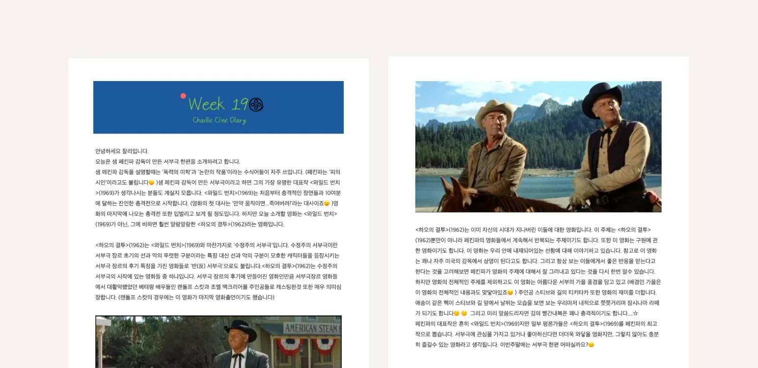매주 토요일 오전 11시, 21세기 이전 영화를 소개하는 뉴스레터 '찰리씨네 다이어리'의 찰리입니다. 영화 소개와 함께 극장에서 해당 영화, 혹은 연관된 영화를 상영하면 그 프로그램도 소개하는 뉴스레터를 보내고 있습니다. 옛날 영화에 관심은 있지만 어디서부터 다가가야 할지 잘 모르겠는 분들과 옛날 영화에 가볍게 다가가고 싶으신 분들을 생각하며 뉴스레터를 기획했어요.
