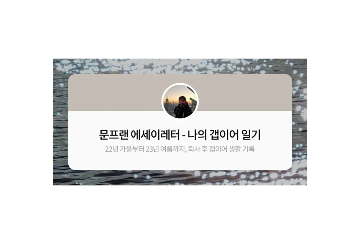 안녕하세요. 에세이레터 <나의 갭이어 일기>를 발송하고 있는 문프랜입니다. <나의 갭이어 일기>는 번아웃으로 퇴사한 후 2022년 가을부터 2023년 여름까지 갭이어(갭먼스)를 가졌던 제 경험담을 담은 ‘갭이어 생활 기록’입니다. 일기 형식의 에세이와 그에 관한 편지를 매주 금요일 저녁 8시에 보내고 있어요.