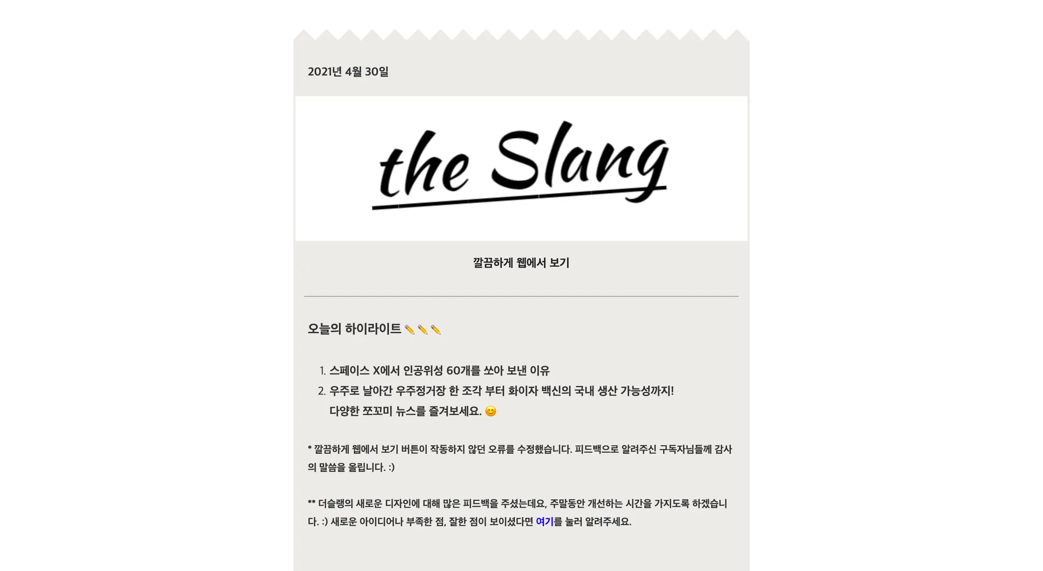맞춤법이 어긋난 부분이 보인다는 피드백을 받고 난 이후에는 매일 맞춤법 검사기를 통해 검수를 하는 과정을 추가하였고, 더 많은 뉴스를 다뤄주었으면 좋겠다는 피드백을 받고 난 이후에는 기존의 메인뉴스 1~3개 구조에서 메인뉴스 2개 + 쪼꼬미 뉴스 3개로 구조를 확장시키는 등 더슬랭의 뉴스레터 제작과정에 영향을 주는 피드백들이었거든요.