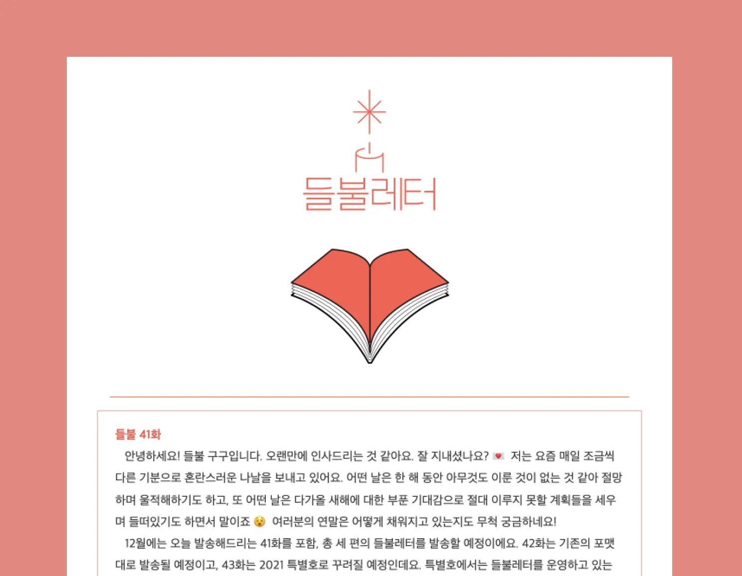 <들불레터>는 2020년 5월, 제가 운영하고 있는 여성 독서 커뮤니티 들불을 알리고, 들불에서 모임 구성원들과 함께 읽고 있는 책들을 소개하기 위한 목적으로 발행하기 시작했습니다. 발행을 지속하다 보니 들불을 알리기 위한 목적 외에 다양한 여성 작가들을 소개하고 싶은 욕심이 생겨 현재는 커뮤니티와 별개로 여성들의 작품을 알리기 위한 콘텐츠 발행에 힘쓰고 있습니다. 뉴스레터 발행을 시작할 당시, 뉴스레터가 새로운 마케팅 수단으로 떠오르고 있었고, 소셜 미디어에서의 홍보에 비해 확장성을 가질 수 있겠단 생각이 들어 뉴스레터라는 방식을 시도하게 되었습니다. 레터를 발행하면서 입소문이 나기 시작하자 SNS 팔로워 이외에 다양한 구독자분들을 만날 수 있었어요.