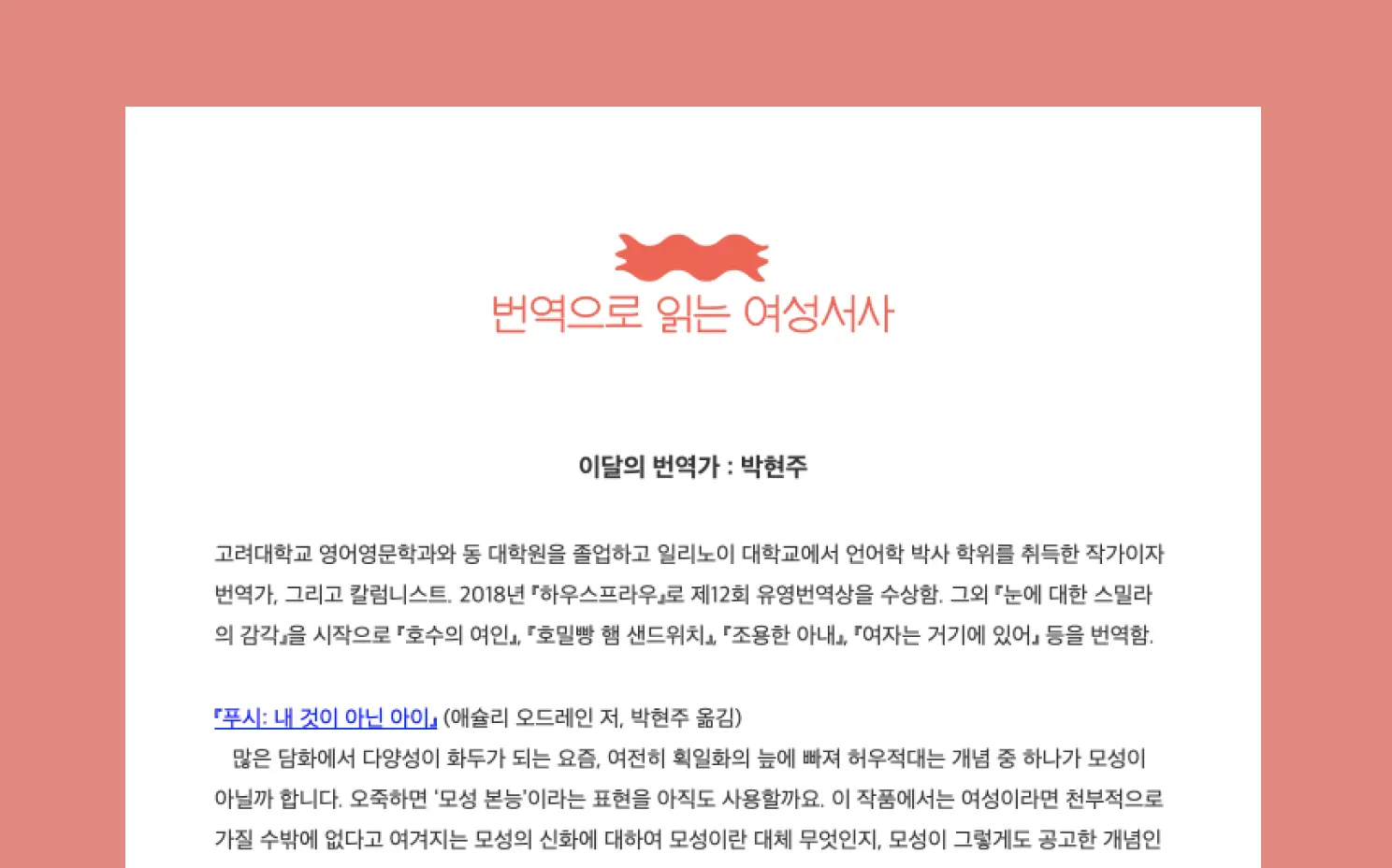 뉴스레터는 구독자분들을 위한 서비스가 분명하지만, 한편으로는 발행인인 제게도 큰 자부심과 자신감을 주는 매체예요. 누군가 나의 글을, 그것도 정기적으로 읽어주고 있다는 사실 하나로 제 삶의 많은 것들이 달라졌어요. 그러니까 지금, 어딘가에서 실패의 경험으로 좌절하고 있는 여성이 있다면 뉴스레터 발행을 추천하고 싶어요. 만약 당신이 레터를 발행한다면, 제가 그 레터의 첫 번째 구독자가 될 준비가 되어있다고도 꼭 말씀드리고 싶습니다.