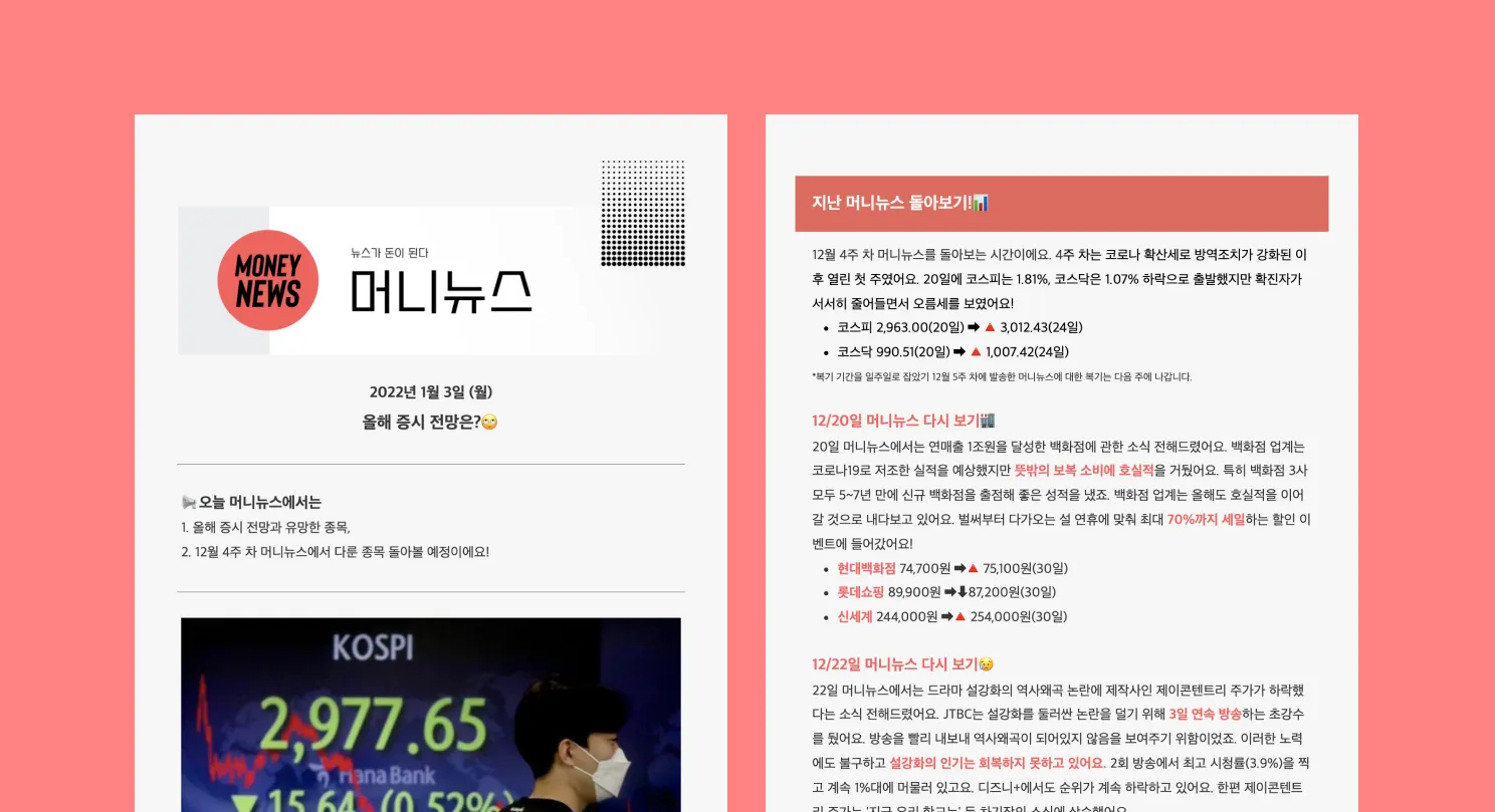 요즘에는 <머니뉴스> 구독자가 늘어나면서 고민이 생겼어요. 아무리 호재가 있다고 하더라도 주가가 상승하는 건 아니거든요. 그래서 구독자분들이 최대한 다양한 의견들을 살펴보실 수 있도록 하고 있어요. <머니뉴스>의 목표는 주식 구매를 유도하는 것이 아니라 구독자분들이 마지막까지 고민하게 하는 것이거든요.